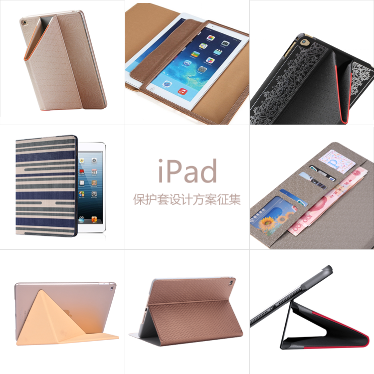1、參照下方圖片所示iPad保護套款式,設計保護套外觀,例如卡通圖案,色彩拼接,文字組合等;