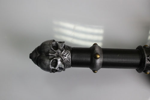 這這把巨大的裝備有1.3米長,重量卻只有600克。Kirby負責設計巨劍的劍身和各部分的連接結構(這把劍被分成了多個部分),而他的朋友 Elliot Viles則負責刀柄及附近的頭骨裝飾。在設計過程中,Kirby主要使用Solidworks軟件,而Elliot則習慣于使用ZBrush。 雖然兩種軟件之間在格式上會有些問題,但Kirby使用Mesh Mixer軟件將兩種設計結合了起來。而且結果表明,并沒有影響到最終的3D打印質量。